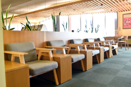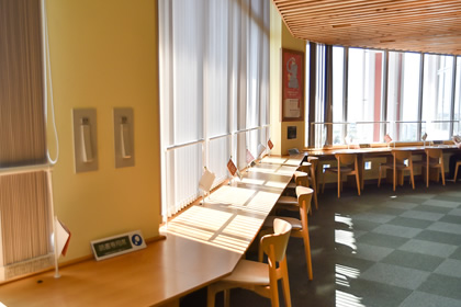 閲覧コーナー 大きなガラス窓沿いに閲覧コーナーをご用意致しました。快適な空間で読書をお楽しみください。