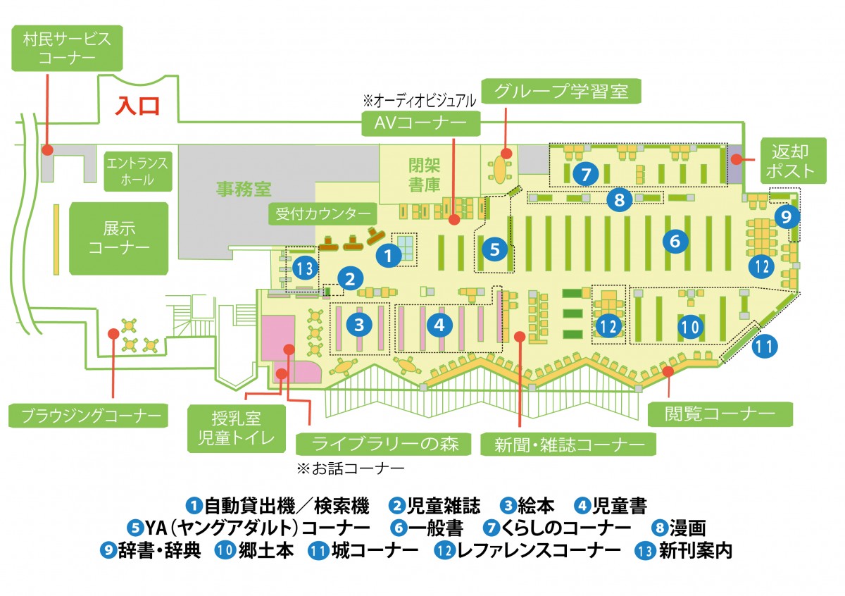 ●図書館内にはAV(オーディオビジュアル)コーナー、お話コーナーなどもございますのでお気軽にご利用ください。